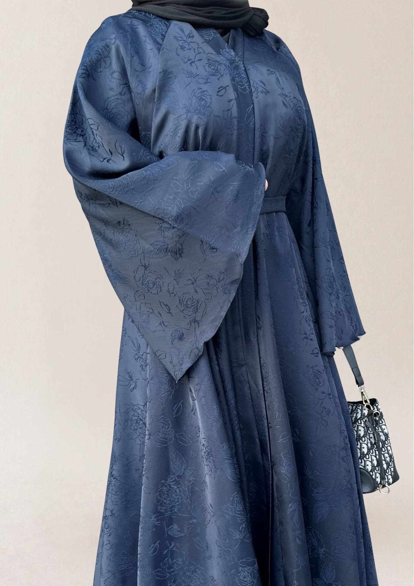 • اللون والتفاصيل: قماش جاكار أزرق داكن مع أنماط زهرية متناسقة اللون